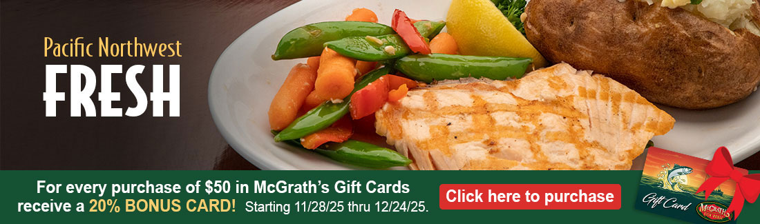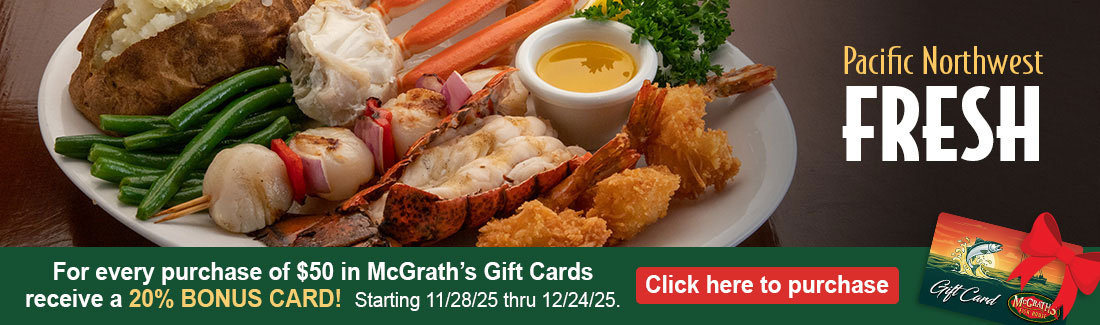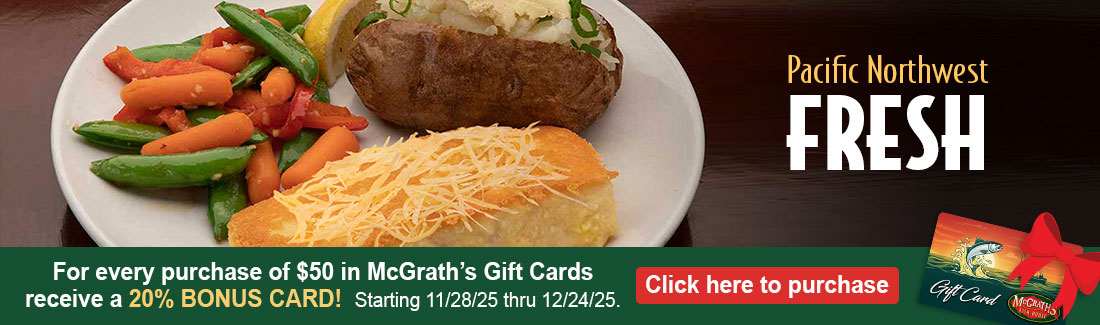 The McGrath family’s love for fishing and harvesting seafood resulted in the opening of McGrath’s Fish House over 41 years ago. Great recipes were developed, including our award-winning clam chowder, making each and every item on our menu memorable. Almost every fish and seafood available from northwest waters including fresh alder plank salmon, halibut, razor clams, and oysters are available on our menu. The wood-fired broiler gives our seafood, steaks and chicken, a very special and unique flavor.