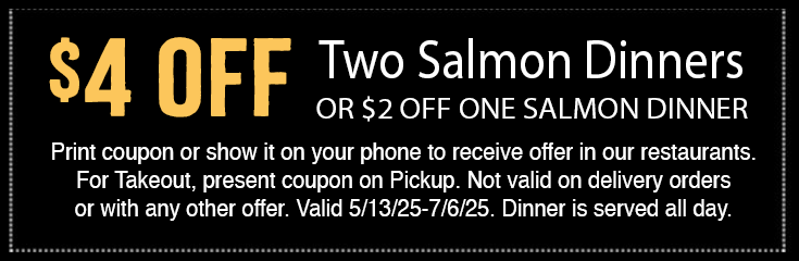 Not valid on delivery orders or with any other offer. Dinner is served all day. Baked Potatoes available after 4:30 pm.