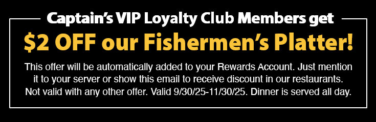 Try our All-You-Can-Eat Fishermen's Platter and get $2 OFF if you're a Loyalty Club Member!