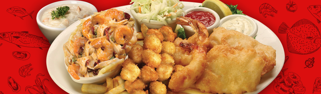 All You Can Eat—Beer-Battered Fish & Prawns, Golden Crisp Clam Strips, Shrimp Pasta Carbonara and Clam Chowder! Served with Coleslaw, Fries and Hot Sourdough Bread.