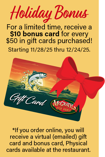 For holidays, birthdays or corporate incentives, McGrath's gift certificates are always in season. Available at each restaurant from your server–or click the button below to purchase one online!