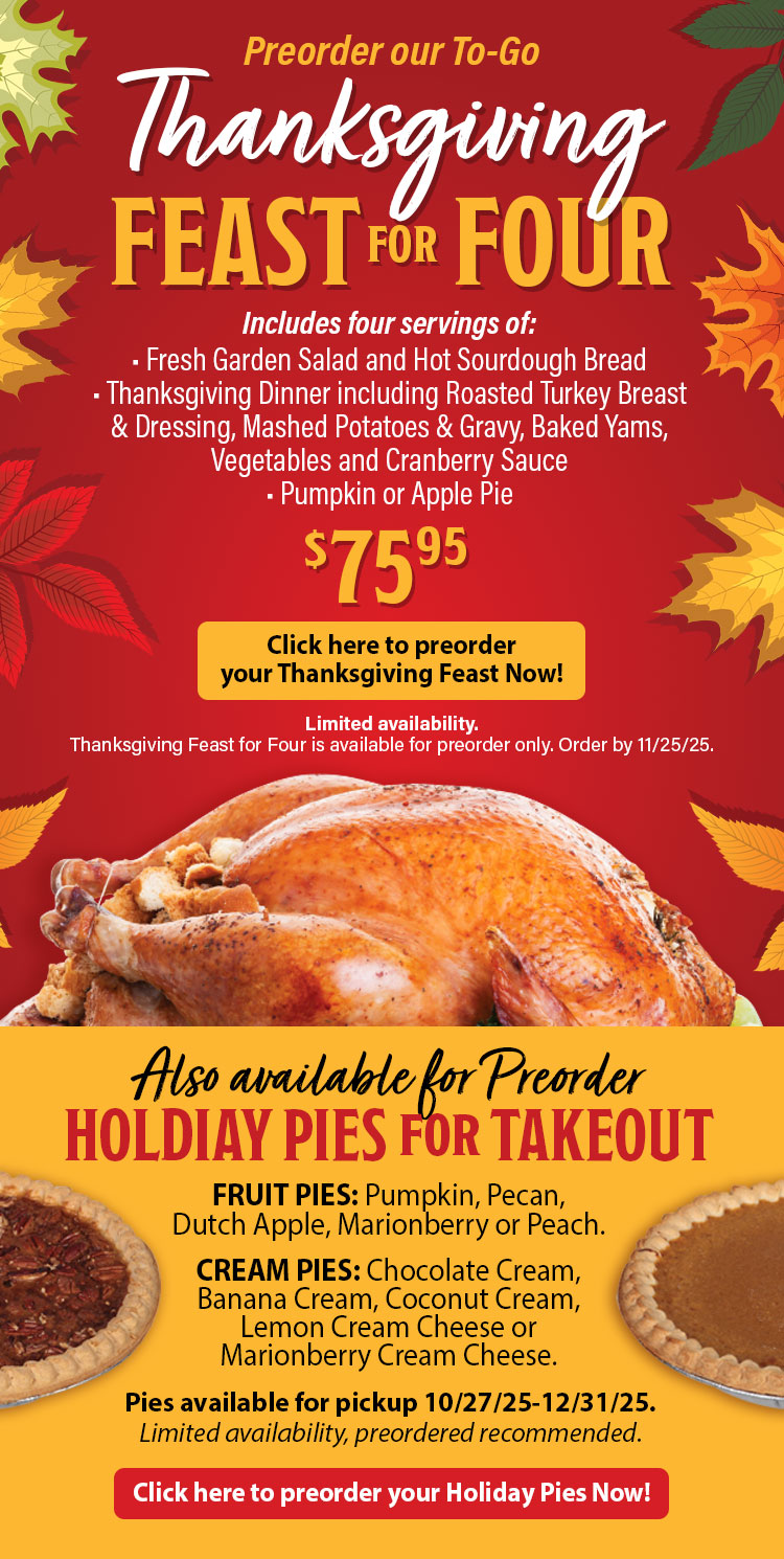 Choice of Chowder or Salad, Choice of 5 Selected Entrées, Choice of Dessert: Marionberry Cobbler ala Mode, Key Lime Pie, or Ice Cream Sandwich.